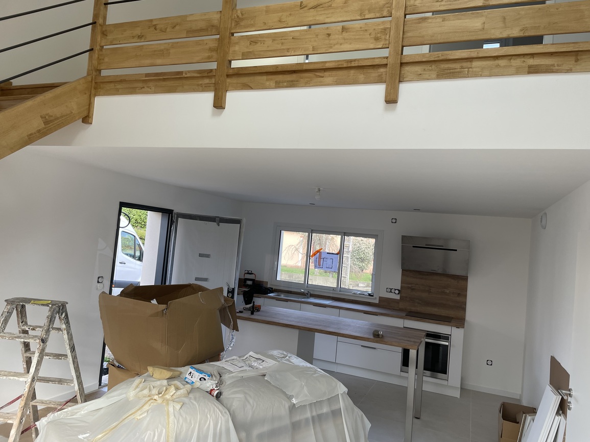 Ponçage complet de l’escalier et des murs, rebouchage soigné des imperfections, mise en peinture blanche satinée de la rampe, application d’un vernis de protection sur la main courante et les marches d’escalier, mise en peinture du mur en teinte anthracite, avec finitions impeccables incluant joints acryliques peints.