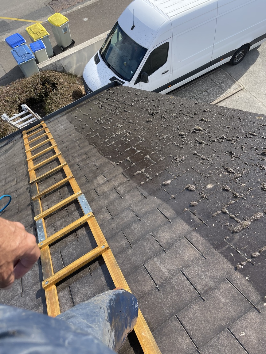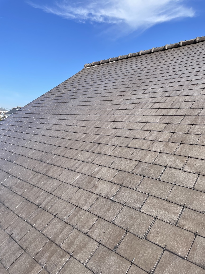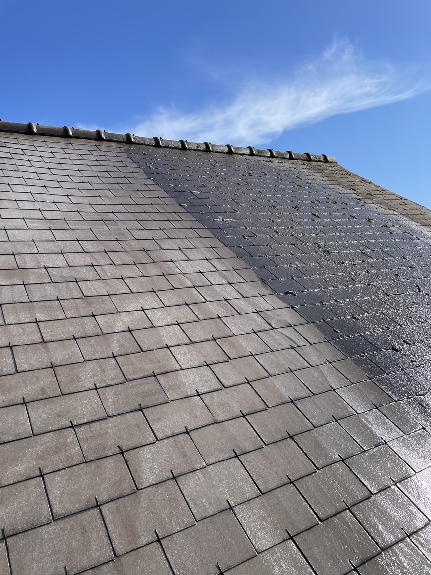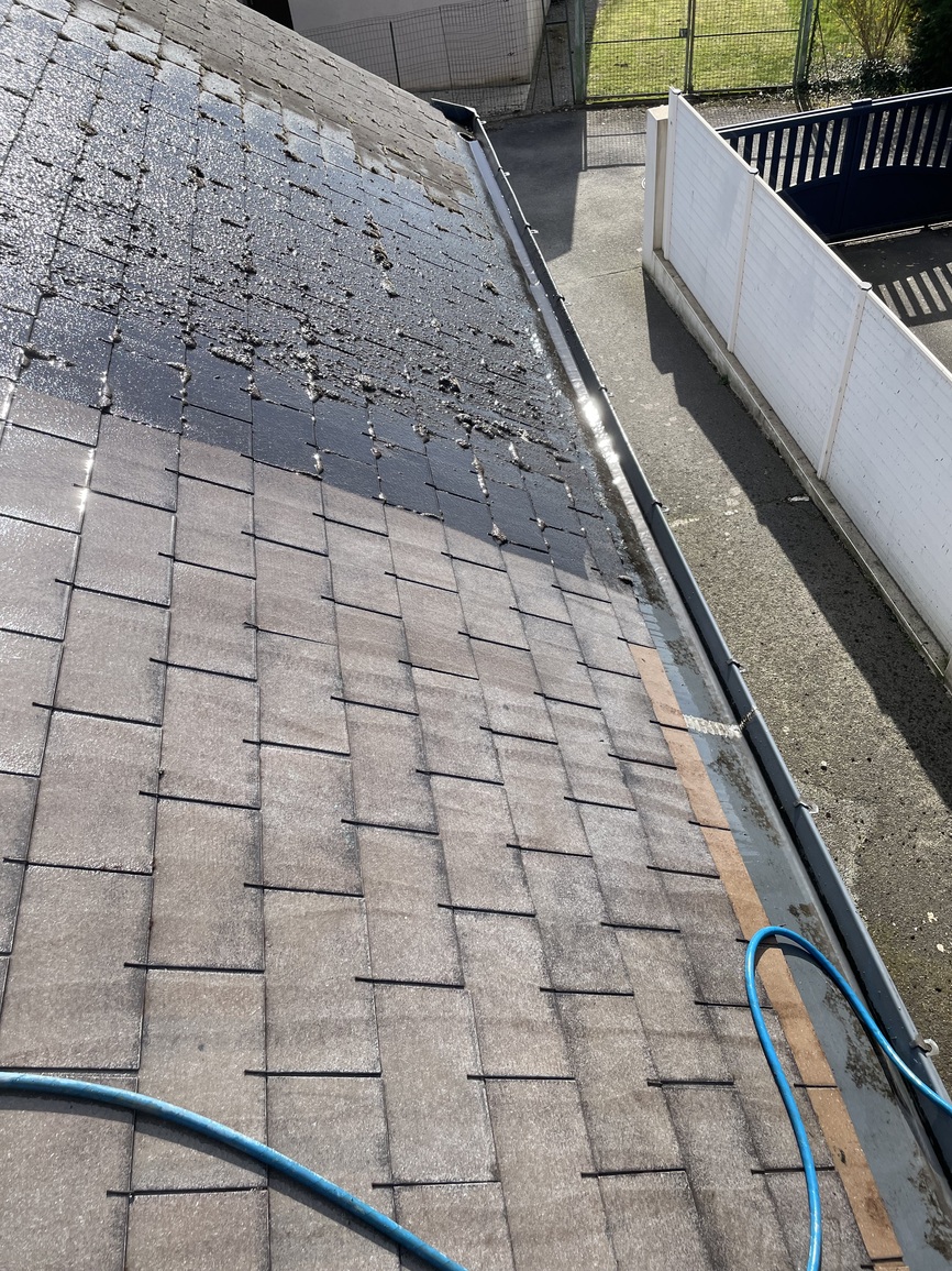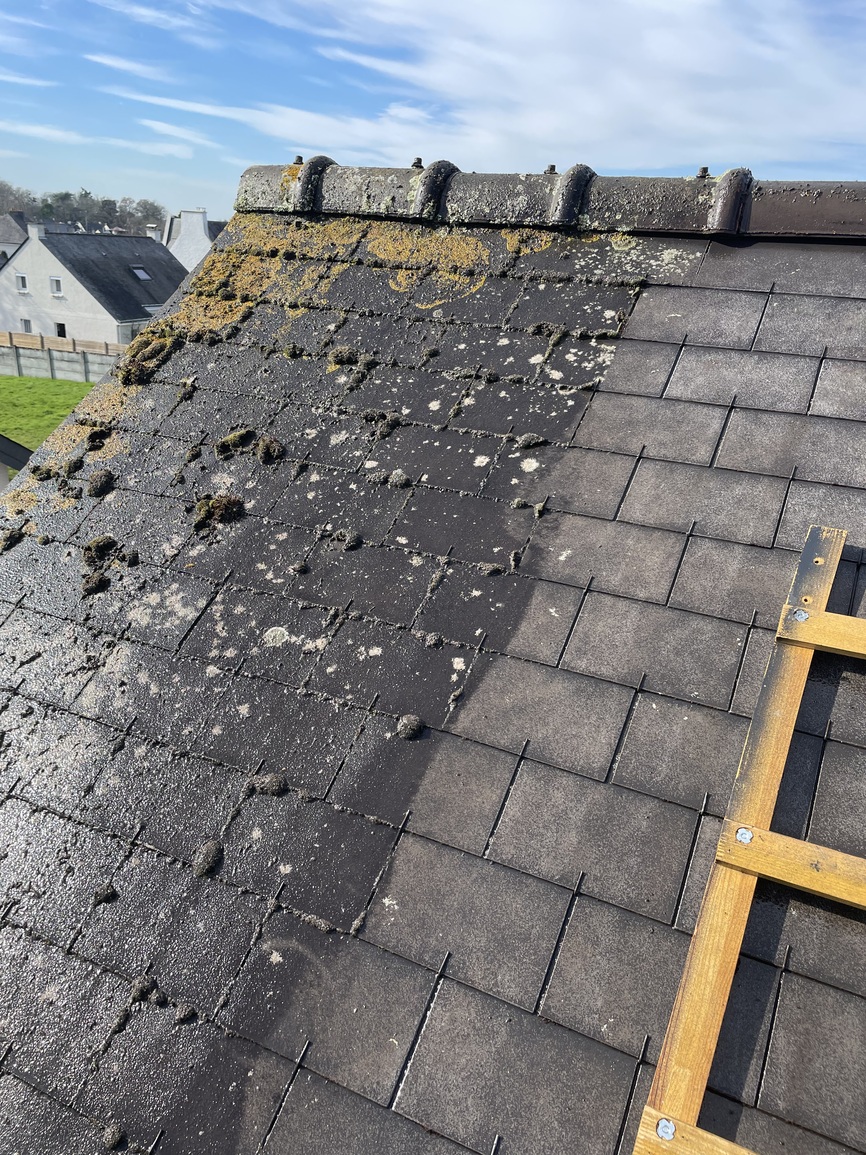 Peinture de toiture Saint-Nazaire- Application d’un hydrofuge coloré sur ardoises fibro après lavage